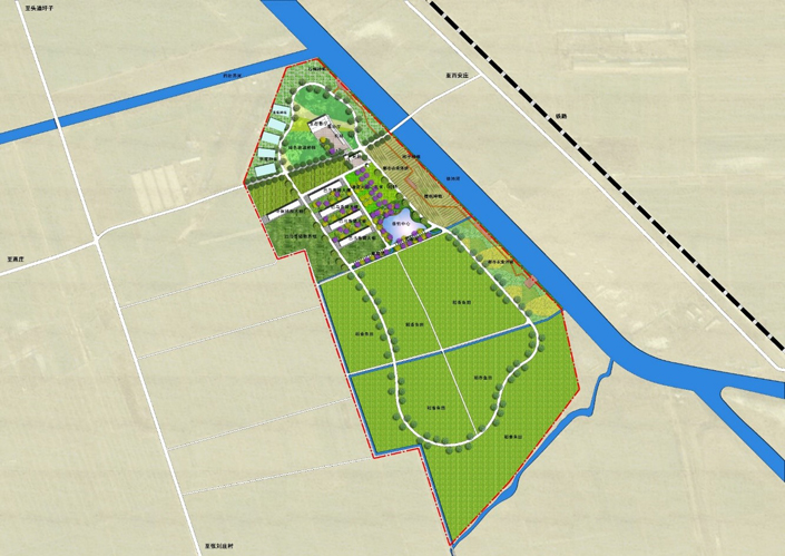 “一带”:滨水景观旅游带,规划利用现有的徐沛河,沿河设置滨水景观步道和亲水水平,再将水域引入农业园中,打造成农业园滨水景观渗透带。