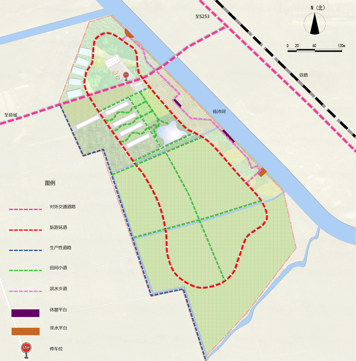 规划有机农业园道路系统为对外交通道路、旅游环道、生产性道路、田间小道、滨水步道以及休憩平台、亲水平台、停车位。